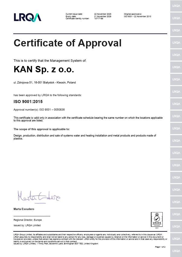 Firma KAN usiluje o naprostou spokojenost zákazníka, rozvoj a modernizaci systému KAN-therm se stará o nejvyšší kvalitu dodávaného produktu a vysoký standard péče o zákazníka. To potvrzuje zdokumentovaný, zavedený a plně uplatňovaný Systém řízení kvality založený na normě ISO 9001:2015, který neustále zdokonalujeme. Systém je potvrzený certifikátem od renomované certifikační instituce Lloyd’s Register Quality Assurance Limited.